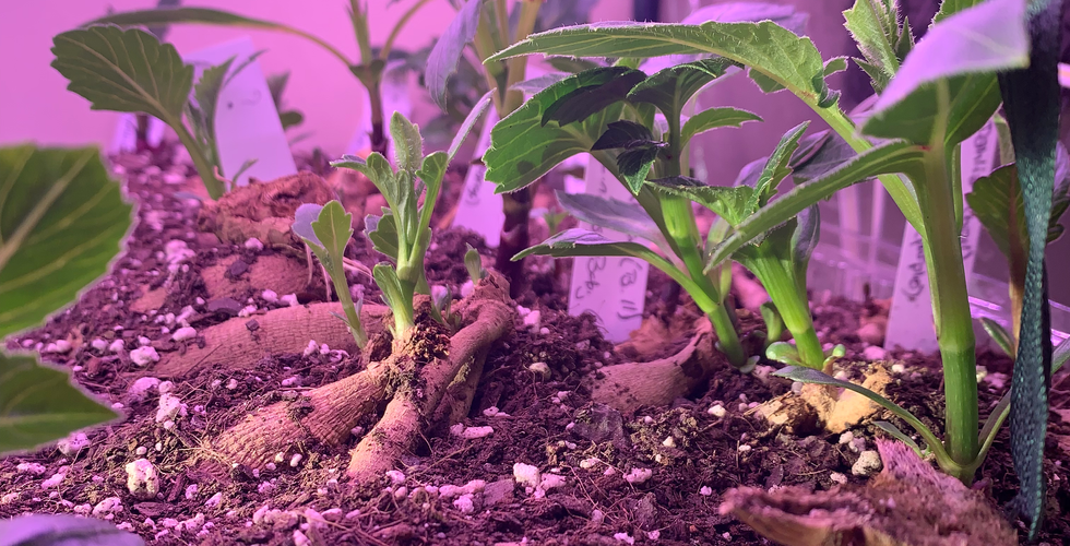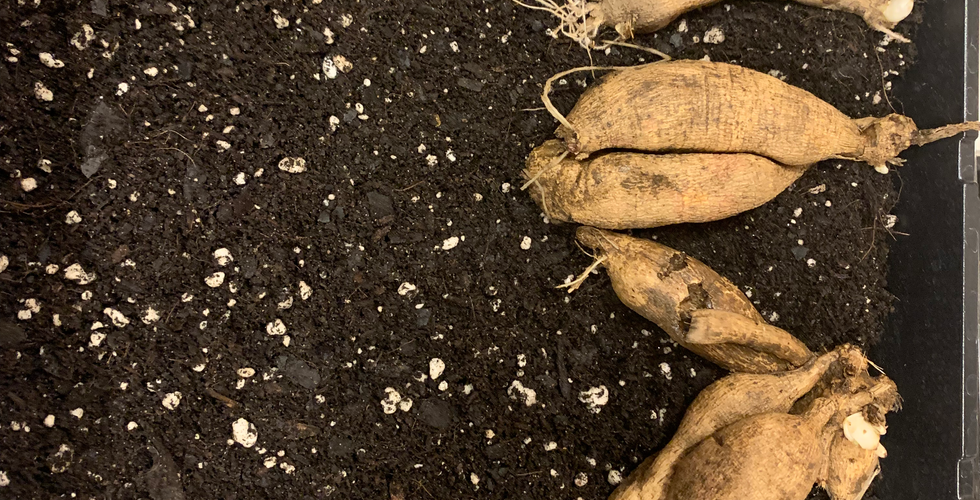 We lay several of our tubers in a flat with a blanket of our soil mix on top to provide even moisture. If you are trying this out, be sure to leave the eyes above the soil and facing up so you can easily see when the eyes start growing stems. Place these trays under lights that promote foliage growth to encourage the formation of stems and leaves from the eyes. Be sure to maintain a consistent “moist” level to the soil in order to keep them happy and healthy. Too much water can lead to rotting, and too little will allow the tubers to dry up. If the tuber looks healthy with no mold, rot, or dryness, but never pops a sprout, toss it; there’s no use wasting water, space, and time on a tuber that isn’t viable. There have been times where what we thought was an eye have turned out to be just a regular bump in the tuber’s surface, and those tubers won’t do much for you unless you want to eat them!